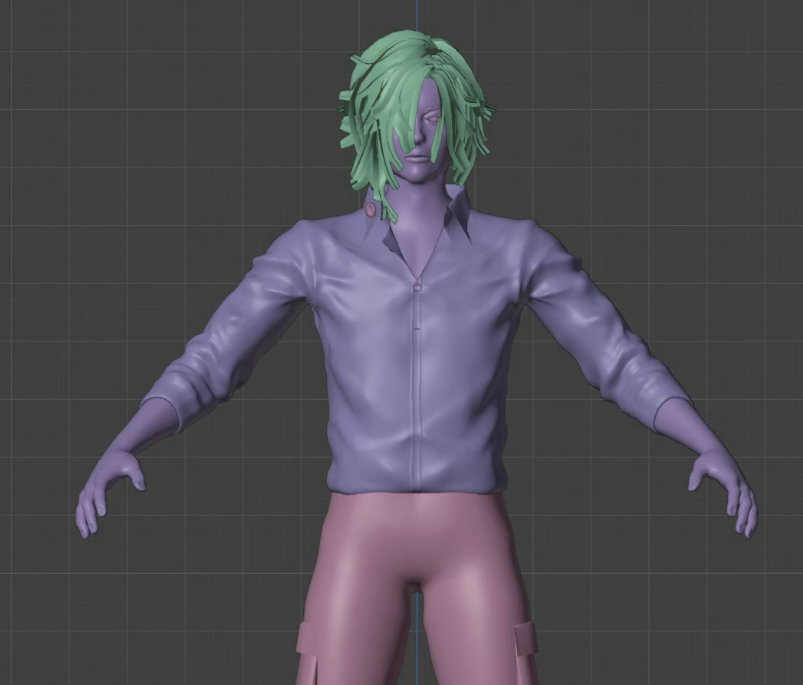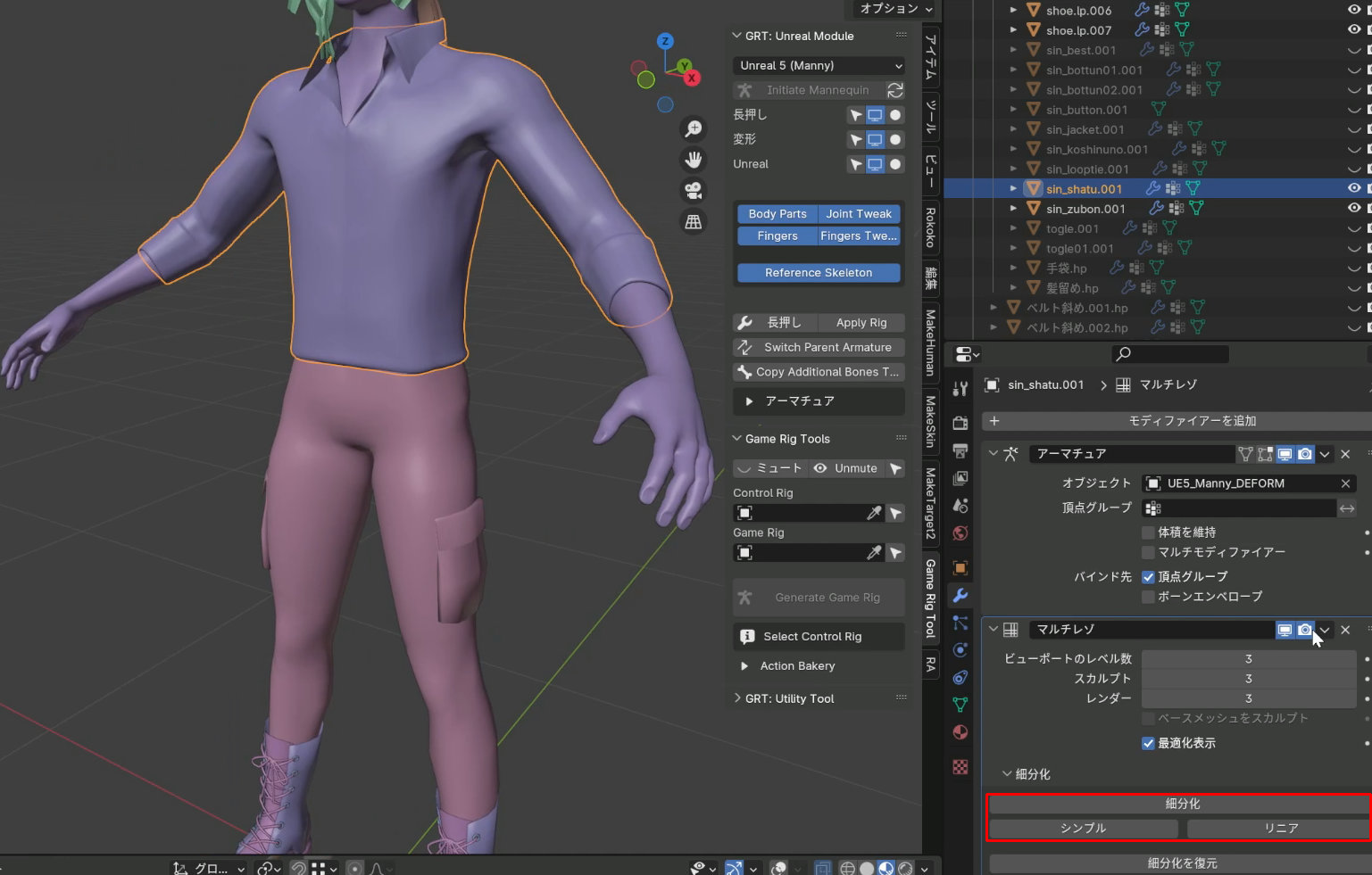 この状態では服がのっぺりしているので、ハイポリメッシュを作ってスカルプトでシワを描いていきます。