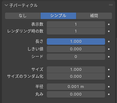 子パーティクルの設定をシンプルにして、表示数とレンダリング時の数を1に、半径を0.001にします。