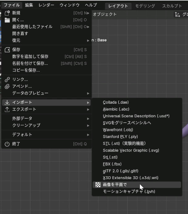 ファイル→インポート→画像を平面での順番で選択し、ラフをインポートします。