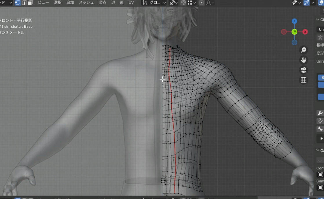 体に沿った楕円形にするために前と後ろのメッシュを一部選択して、
