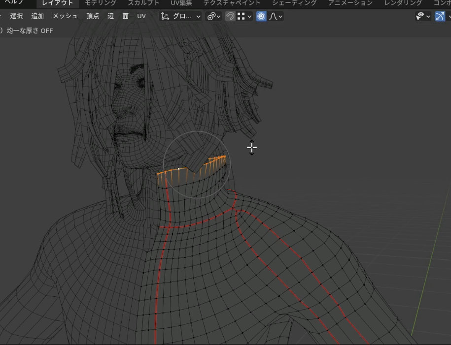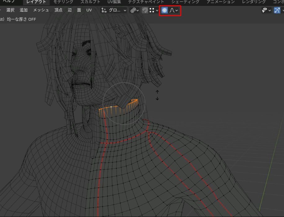 襟元を全体的に広げたいときは襟の端のメッシュを選択した状態でプロポーショナル編集をオンにします。
