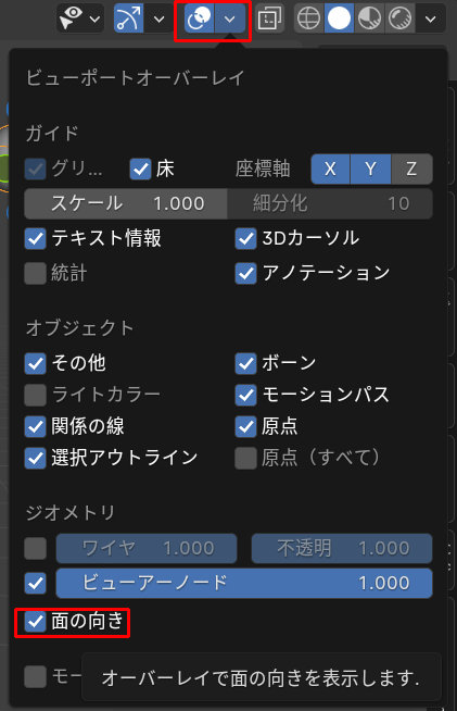ビューポートオーバーレイの面の向きのチェックを入れるとメッシュの裏表を確認することができます。