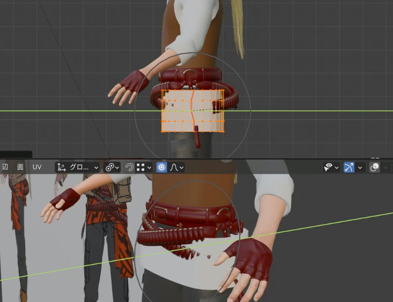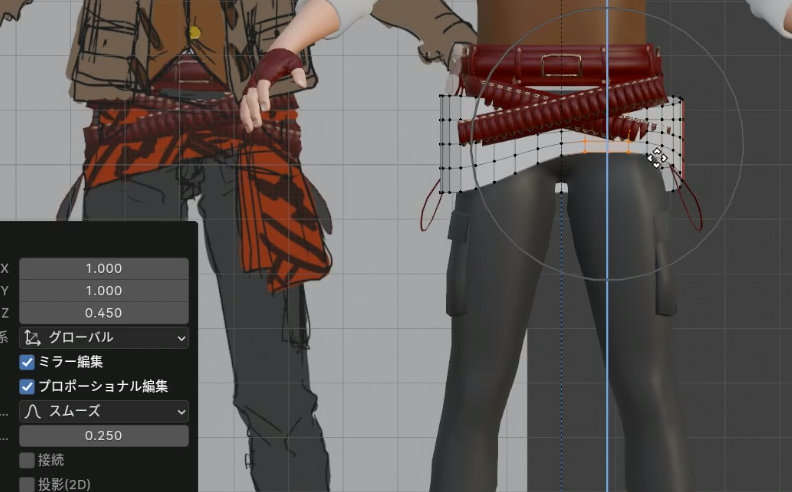 結び目に近い部分で幅を狭めるときもプロポーショナル編集が使えます。