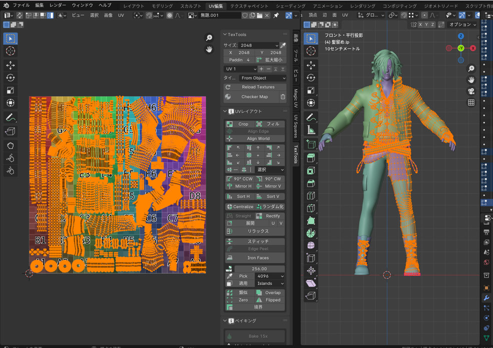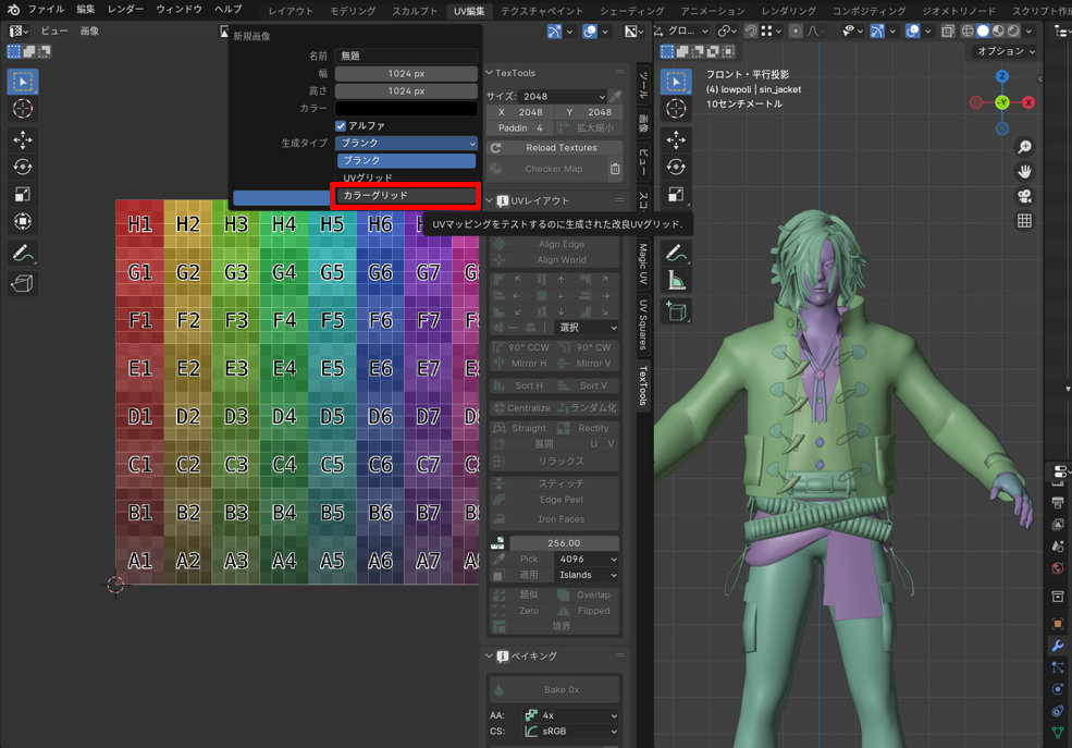 この時TexToolsのCheckerMapをクリックしてメッシュのほうにカラーグリッドを表示しておくと、メッシュの歪みやサイズの不均一を視認しやすいです。