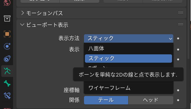 GameRigToolsのボーンと重なって見えにくい場合は、MakeHumanのボーンをスティック表示にしておきましょう。