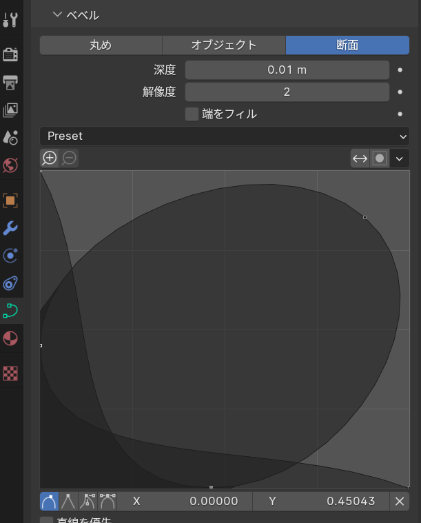 ベベルから「断面」を選び、深度を「0.01m」に、断面の形状を画像のようにします。
