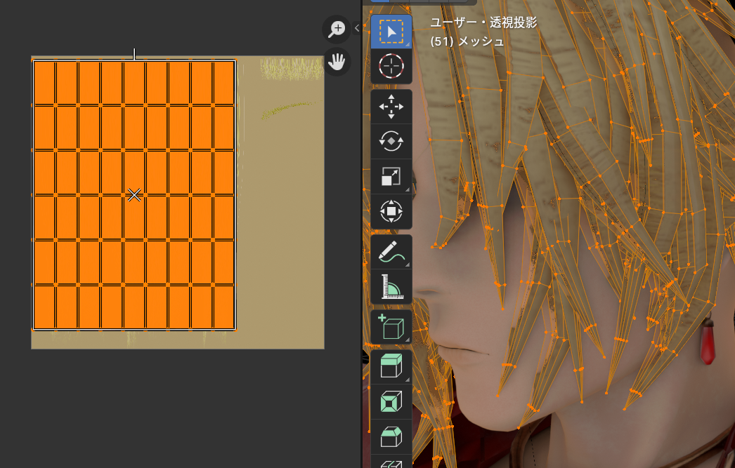 UVエディタに入ってメッシュ変換した髪を全選択するともうすでに展開が済んで、すべての房がぴったり重なって表示されているので、すべてのUVを重ねたまま髪のテクスチャとサイズを合わせます。