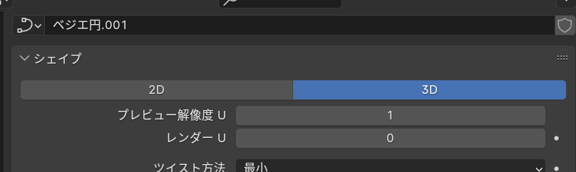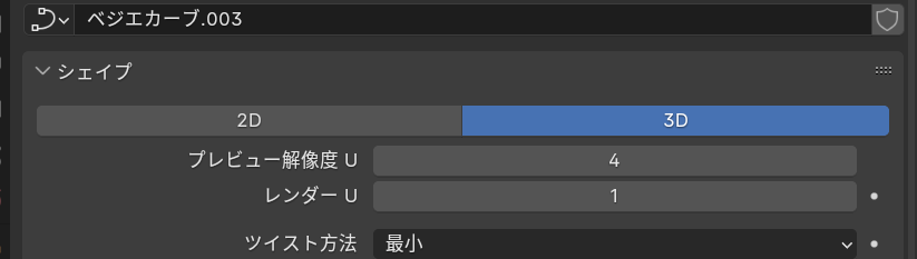 カーブのプロパティでシェイプのプレビュー解像度を1に、ベベルの深度を0.00025、解像度を1にします。