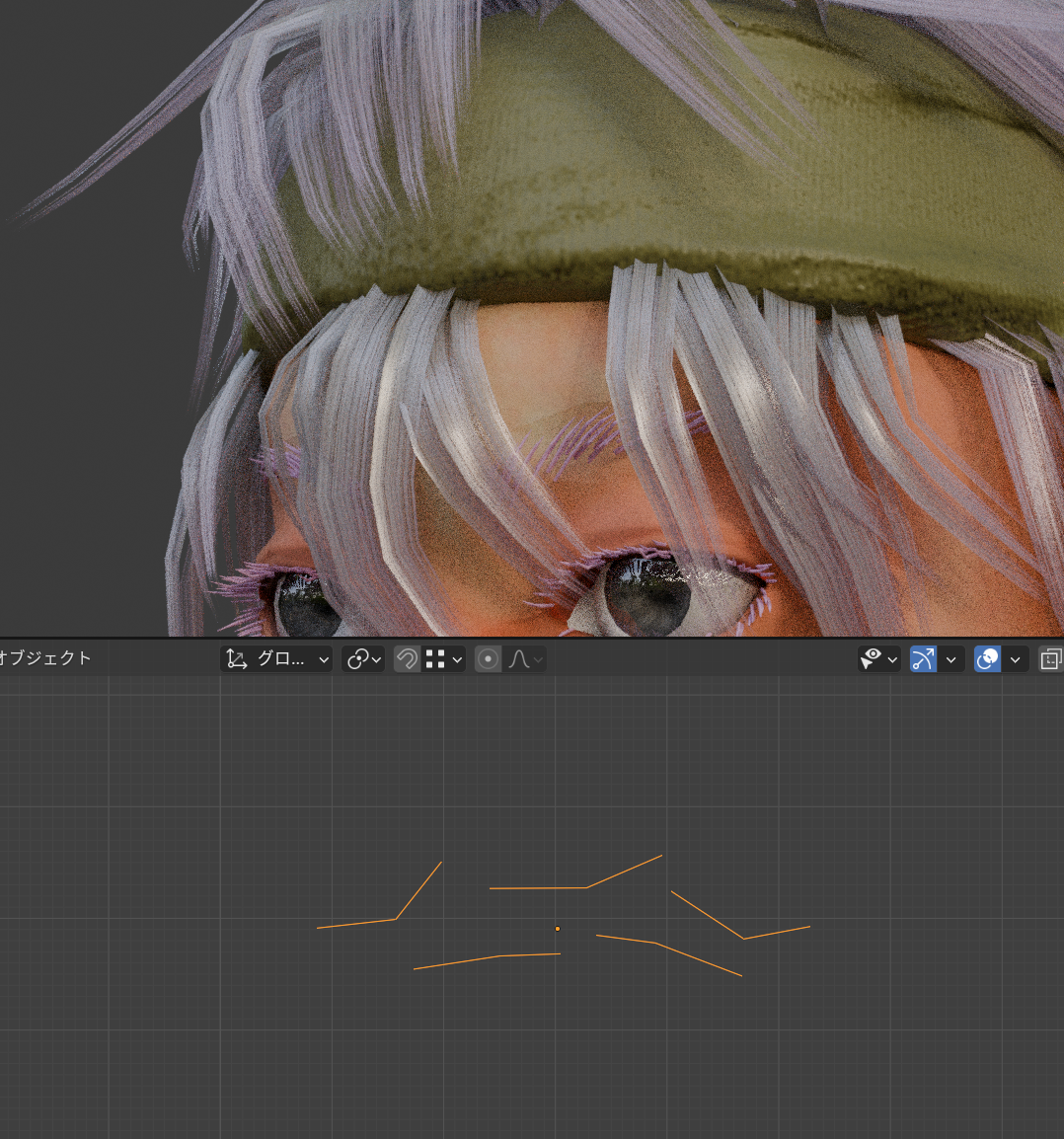 Alt+Aで選択解除してから下まつ毛だけをすべてLでリンク選択して、下まつ毛の形状を整えていきます。