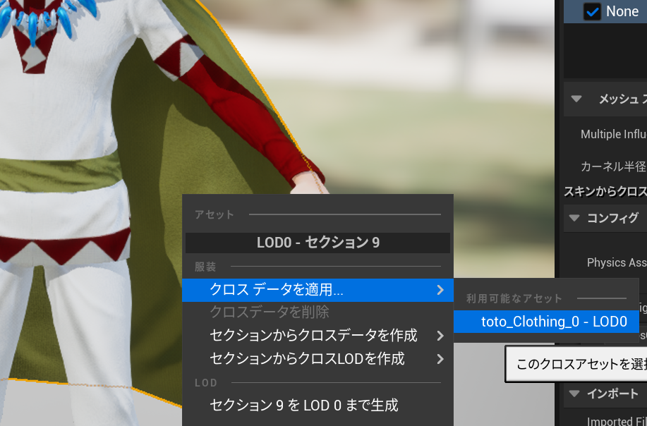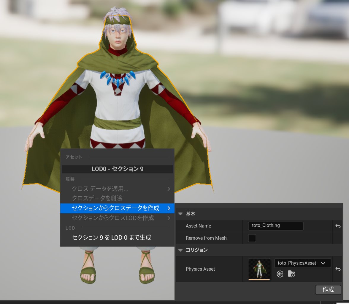 クロスデータを作成したいメッシュを右クリックして、セクションからクロスデータを作成、作成を選択します。