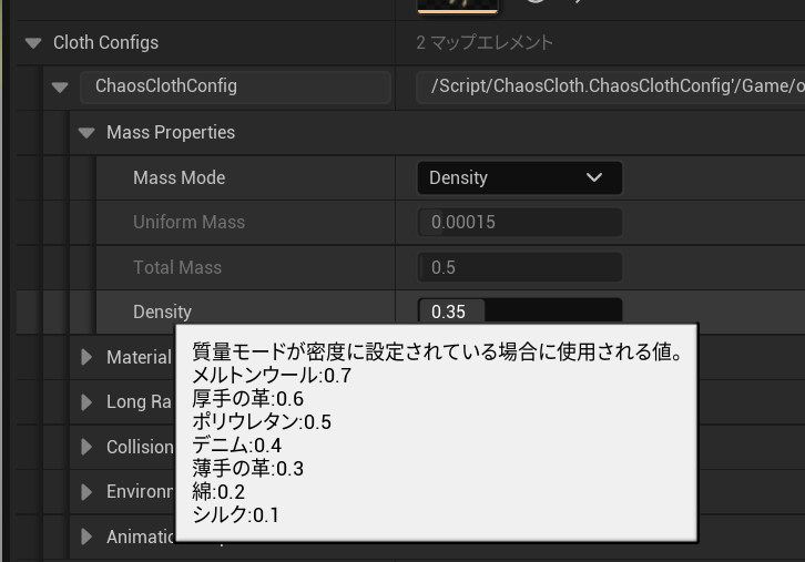 Density以外を選択しても何がどう変わるのかよくわからなかったのでとりあえず布の硬さを変えたい場合はDensityの数値を変えるだけでいいと思います。