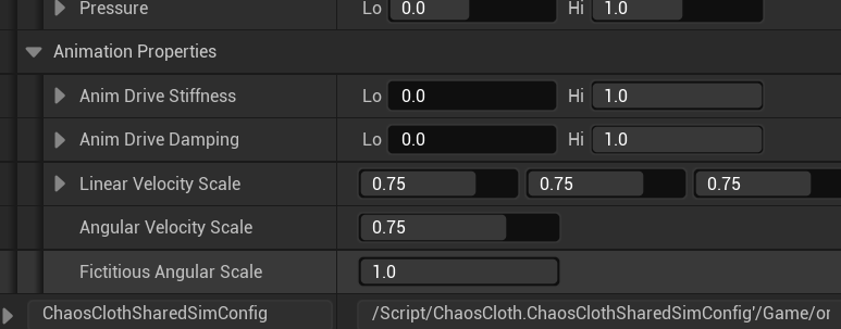AnimDriveStiffnessとAnimDriveDampingのloの値を0以上にすると布の動きが元のアニメーションに従ってある程度制限されます。