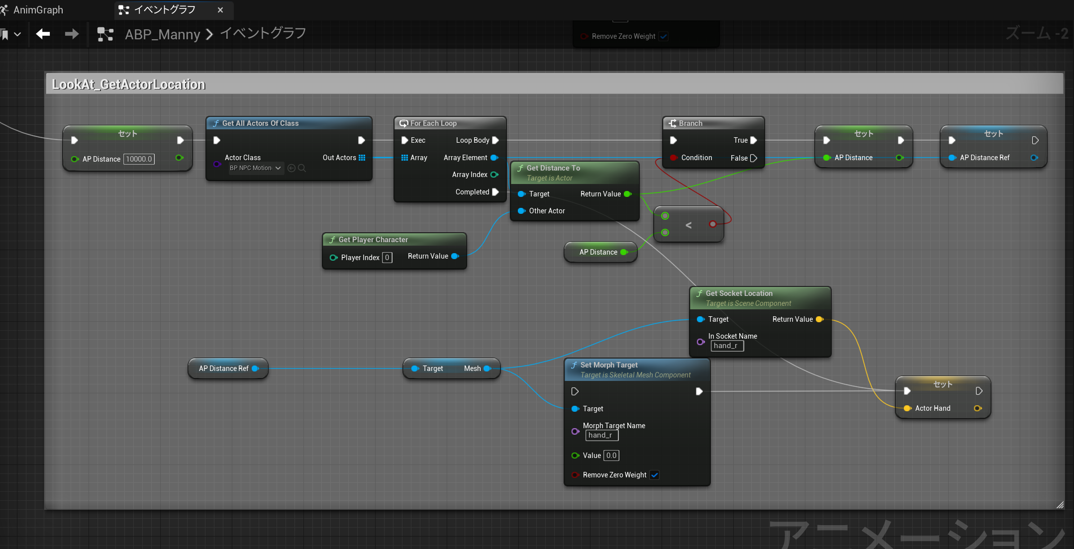 GetAllActorsOfClassに親NPCを設定し、子NPCの中から一番近いNPCを検索して、手のボーン位置を取得します。