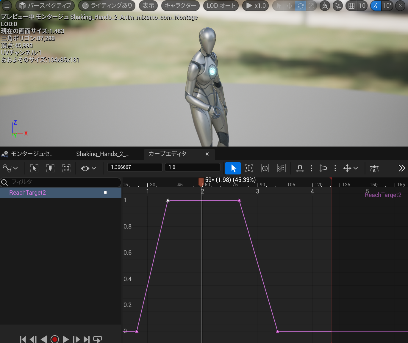 カーブを追加し、手を差し出して引っ込めるところの値が1.0になるようにします。