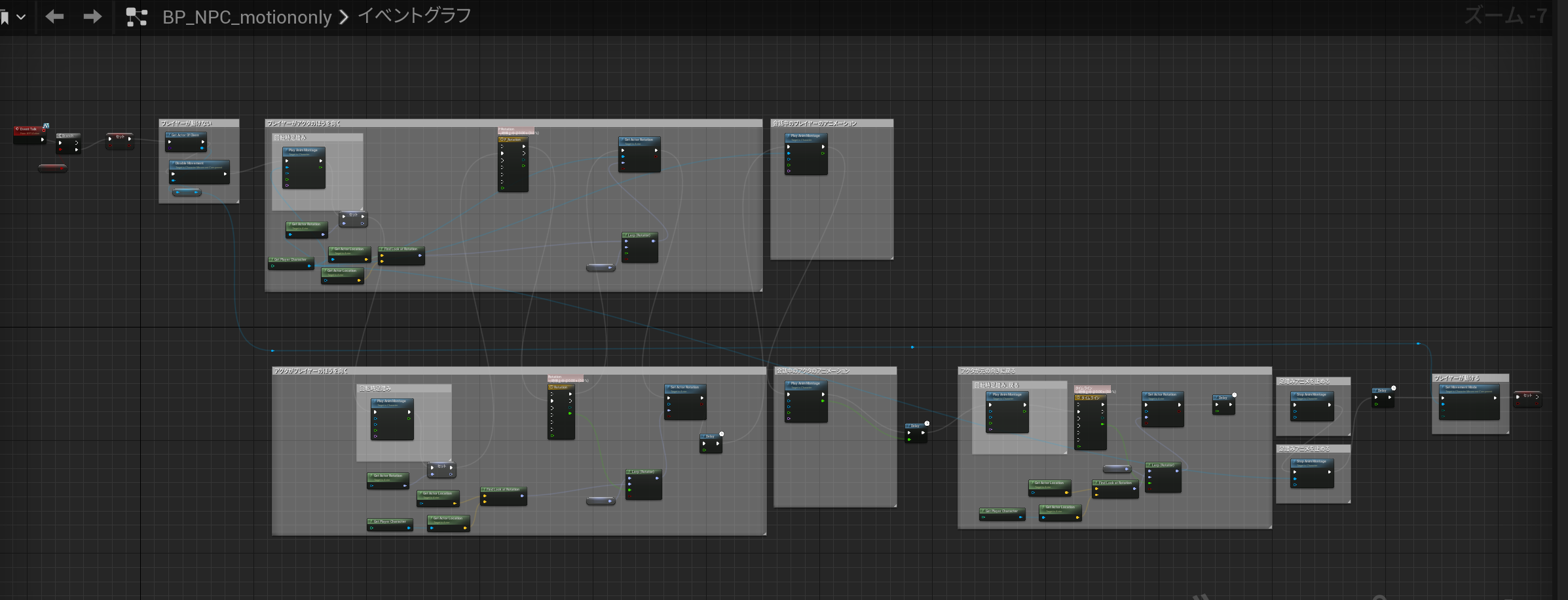 BPIを利用して、エンターを押すと、プレイヤーの操作を無効にして、プレイヤーとNPCが向き直って、握手のアニメーションを再生して、NPCの向きだけが元に戻って、プレイヤーが動けるようになる。