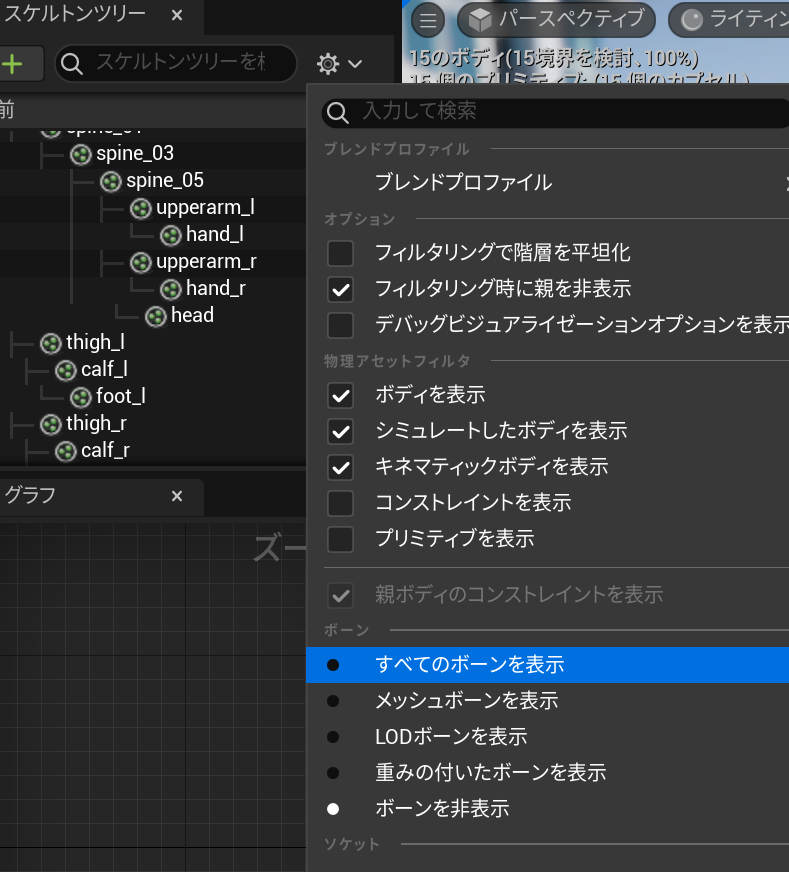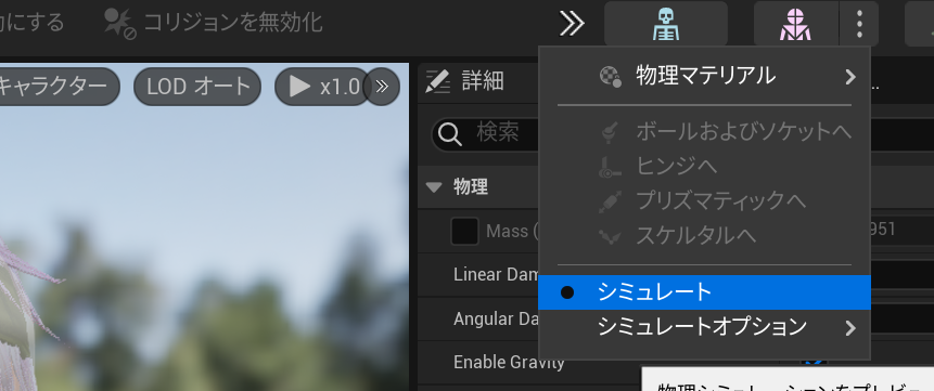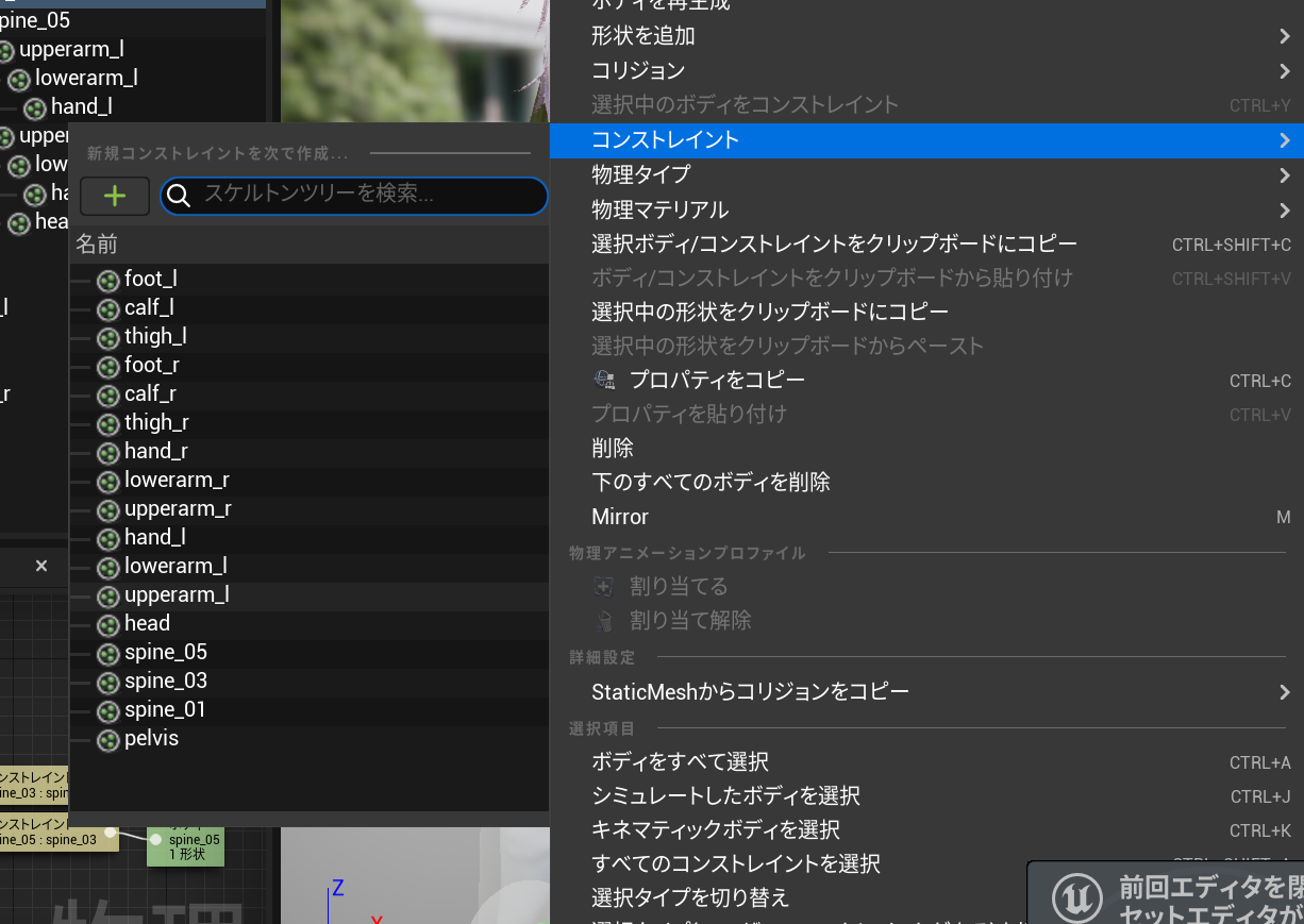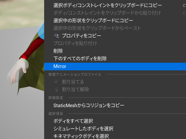 もしも作成されていない場合は、スケルタルメッシュを右クリックして、作成する、物理アセット、作成を選択してください。