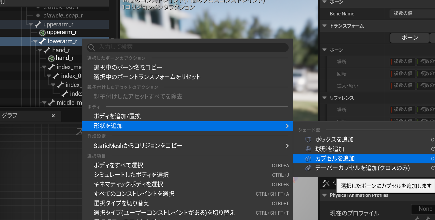 ボーンの一覧からコライダーを追加したいボーンを選んで右クリックして、形状を追加、カプセルを追加を選択します。