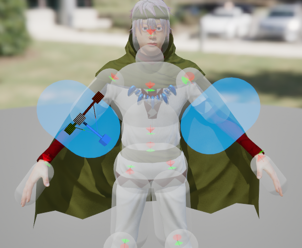 カプセル型の体の部位ごとにコリジョンを設定するものがコライダー、コライダーとコライダーの間をつなぐ扇形のものがコンストレイントです。