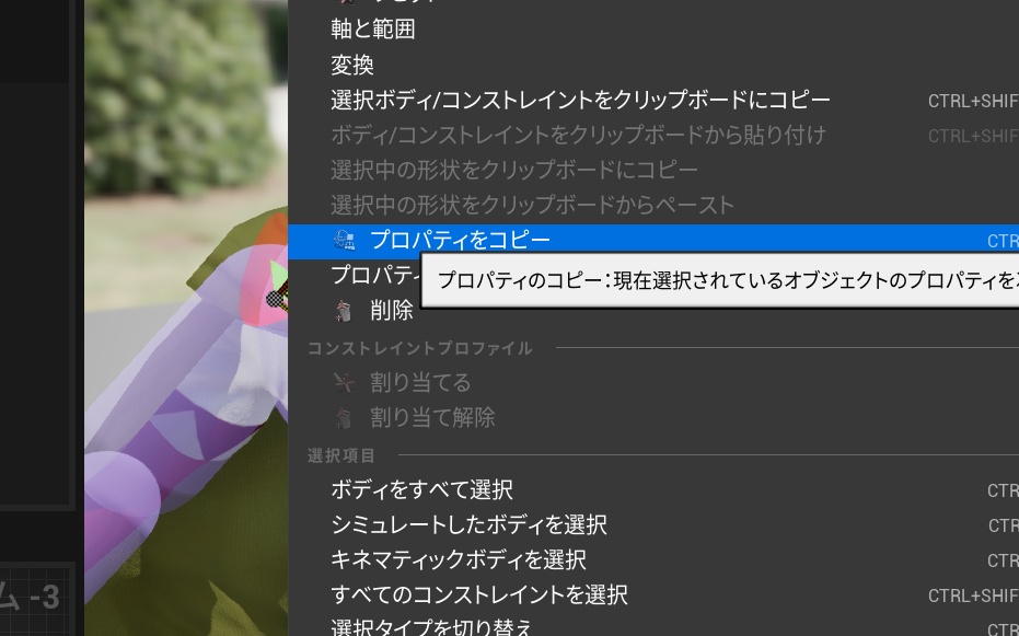 右肩のコンストレイントの上で右クリックしてプロパティをコピーを選択します。