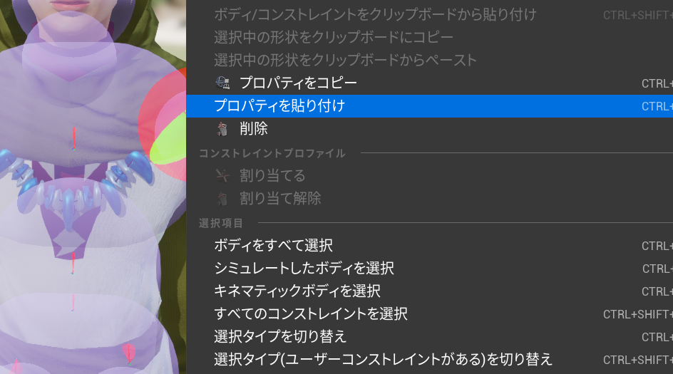 左肩のコンストレイントの上で右クリックして、プロパティを貼り付けを選択します。