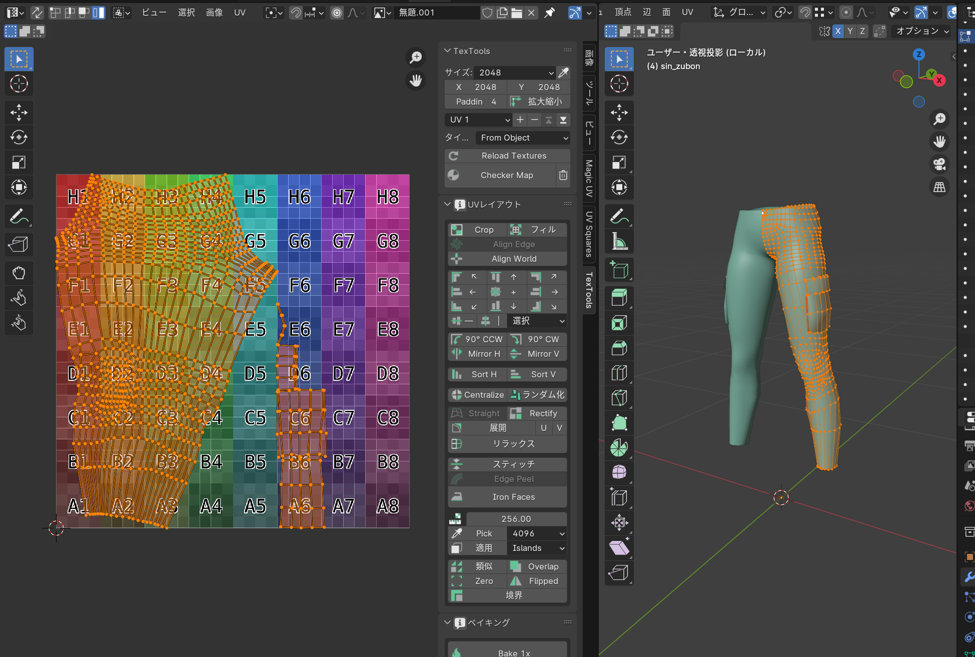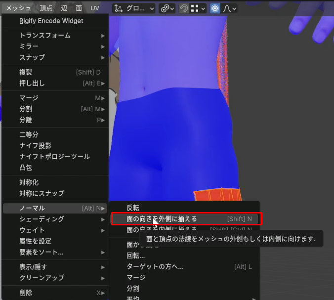 ポケットのメッシュをLで全選択して、メッシュ→ノーマル→面の向きを外側にそろえるを選択して面の向きをそろえましょう。