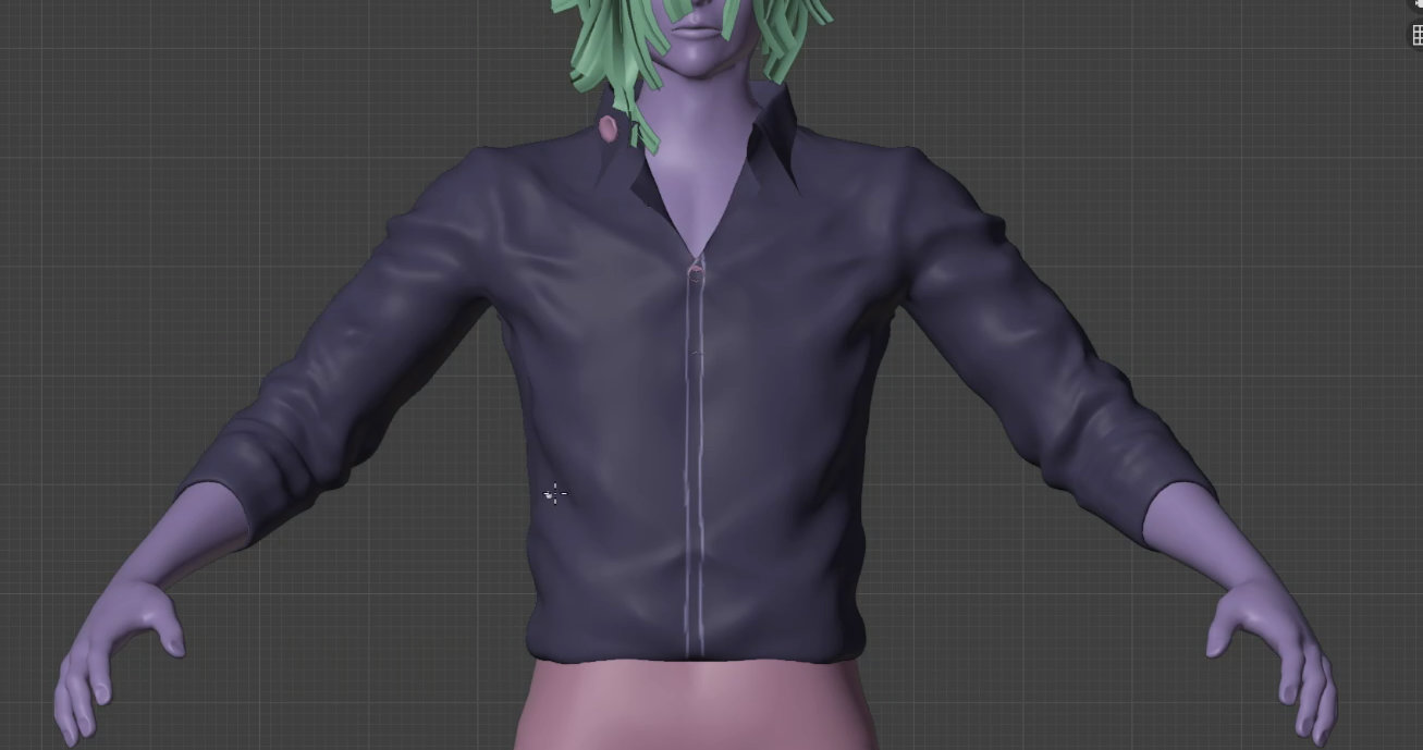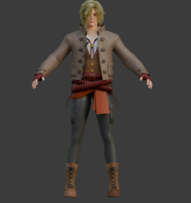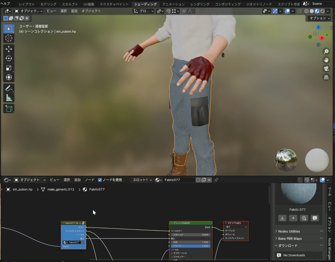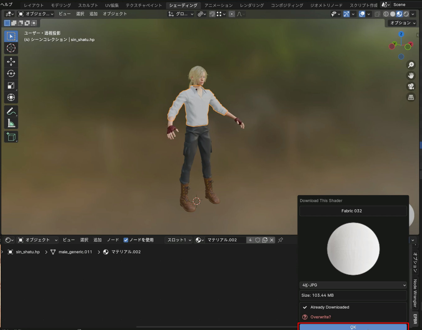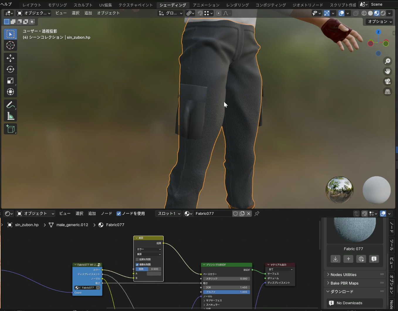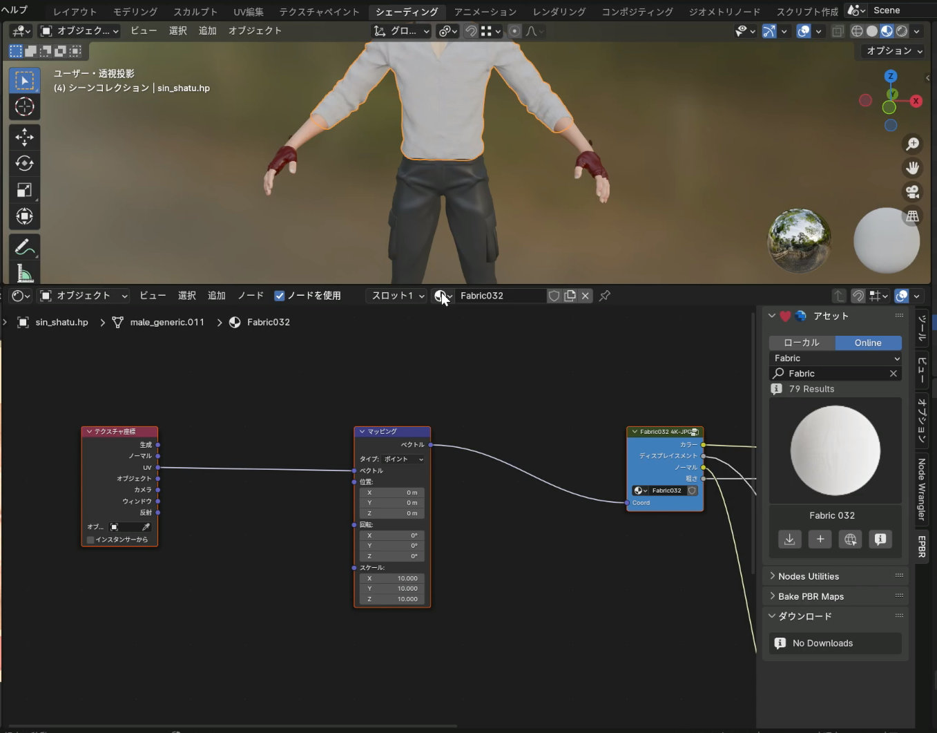 この後、正式なマテリアルを設定したり、服のシワなどの凹凸を作ったり、各オブジェクトのマテリアルをテクスチャ化したりする作業があります。