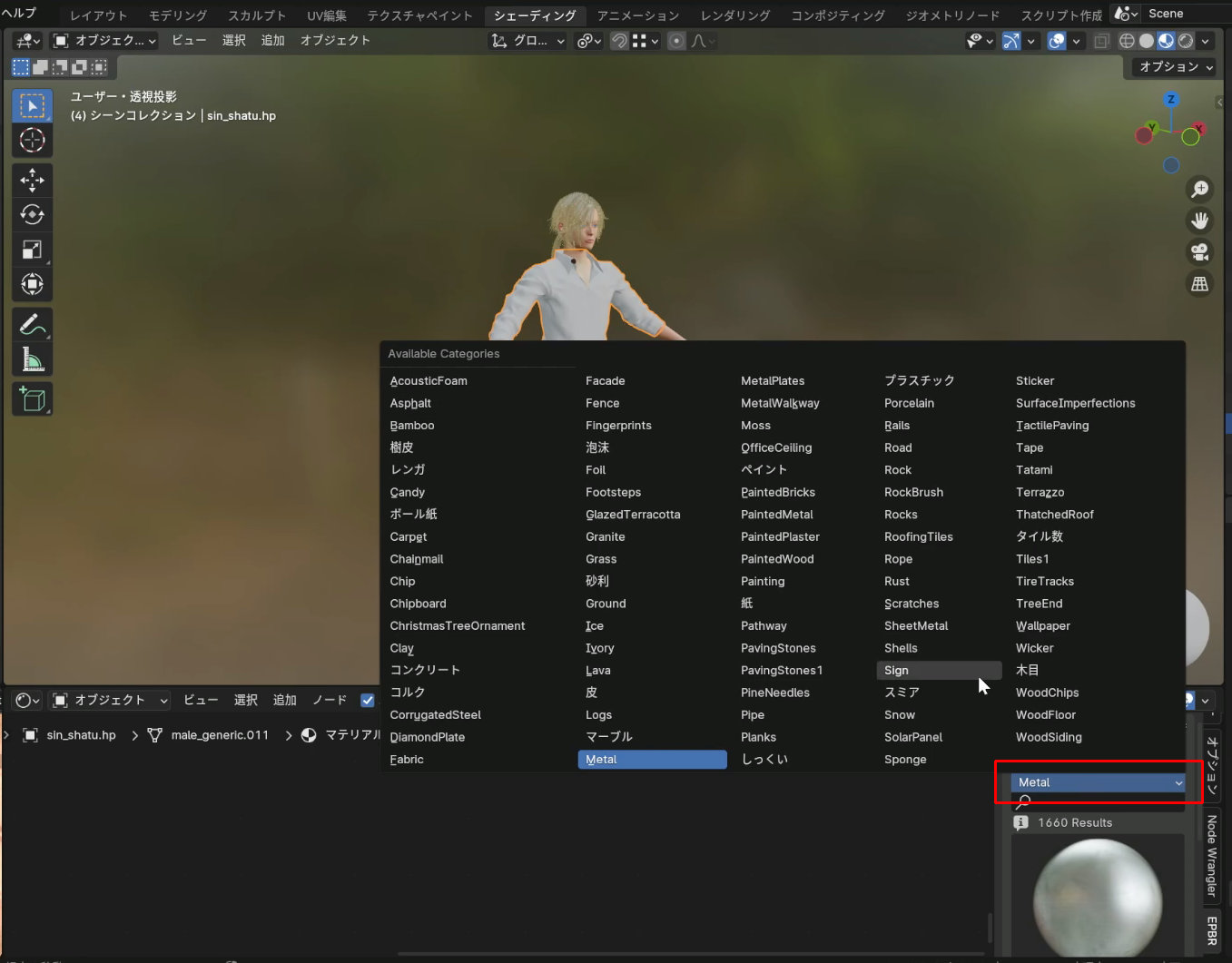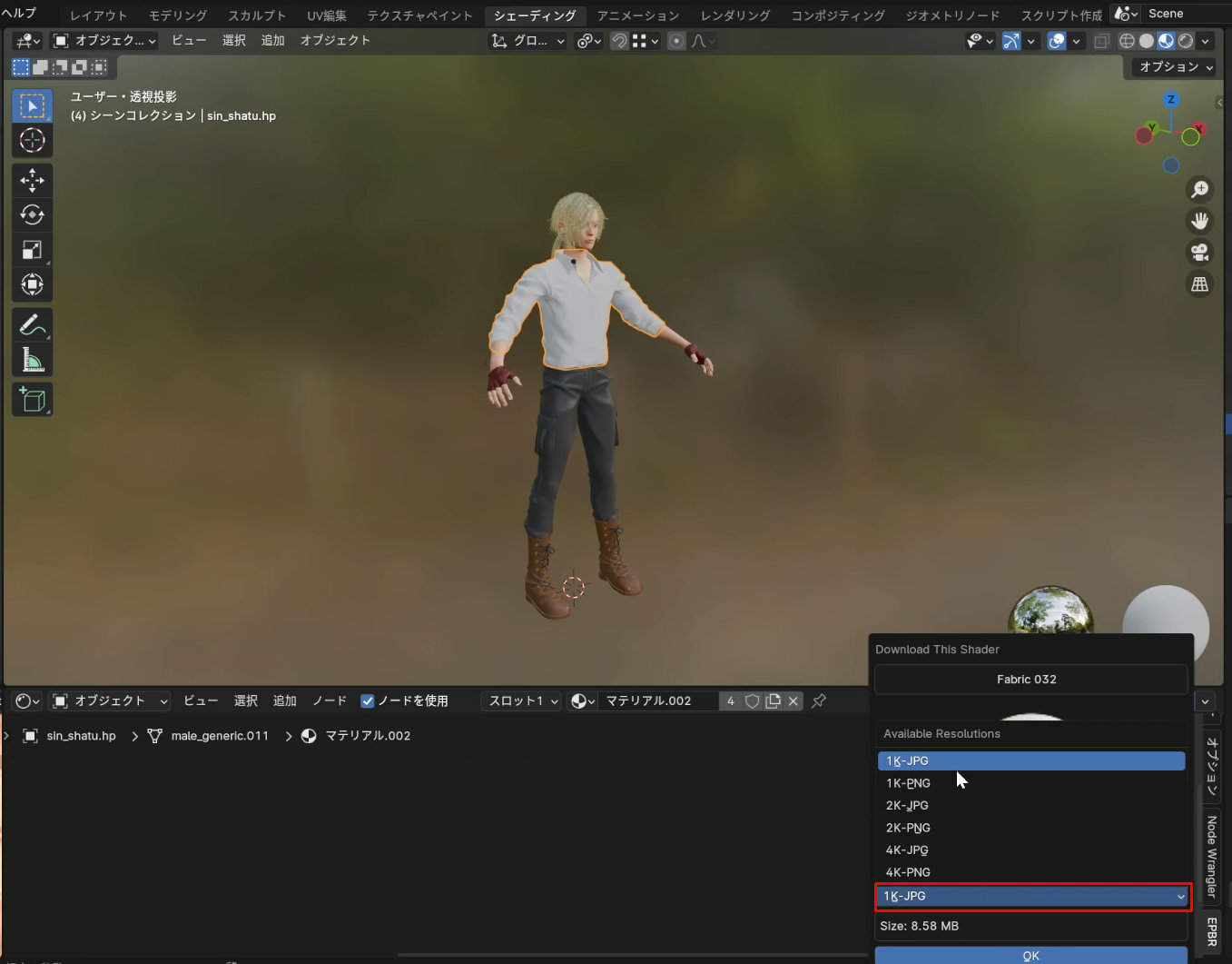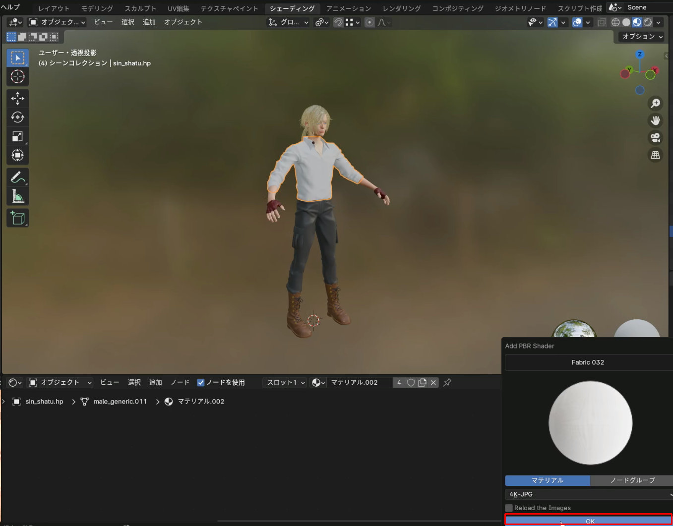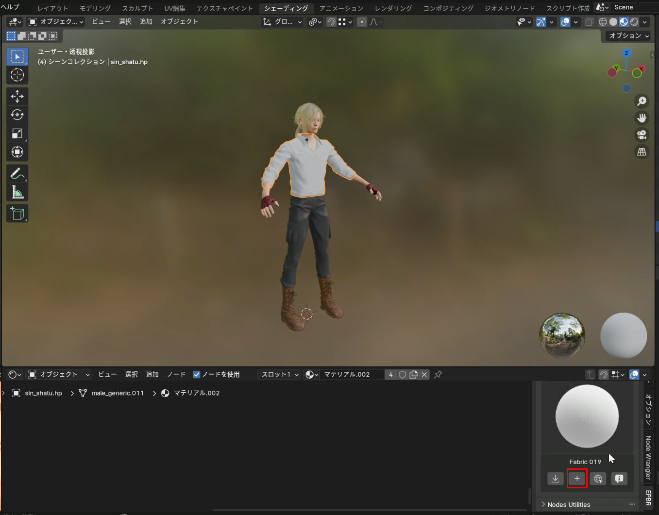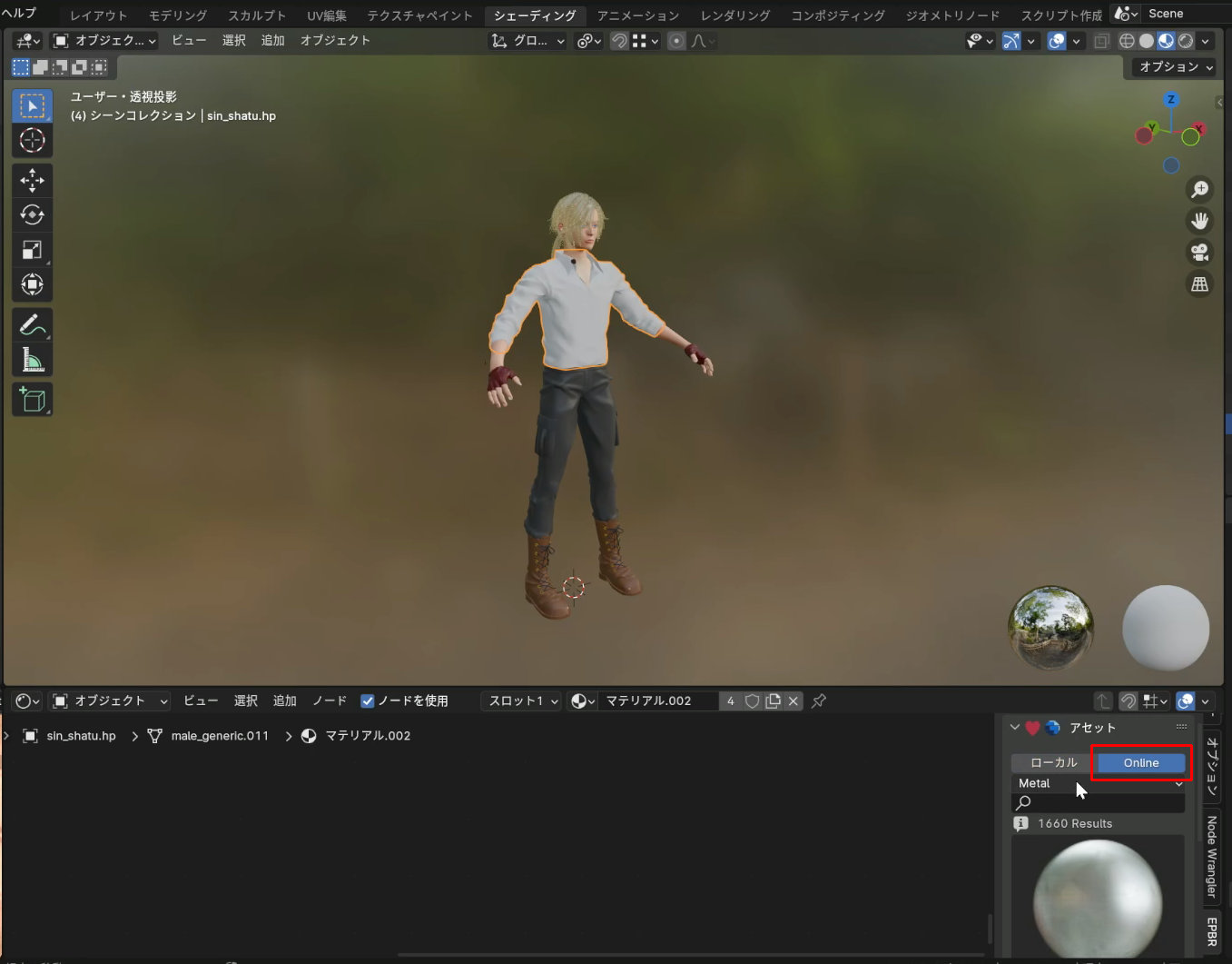 この後、正式なマテリアルを設定したり、服のシワなどの凹凸を作ったり、各オブジェクトのマテリアルをテクスチャ化したりする作業があります。