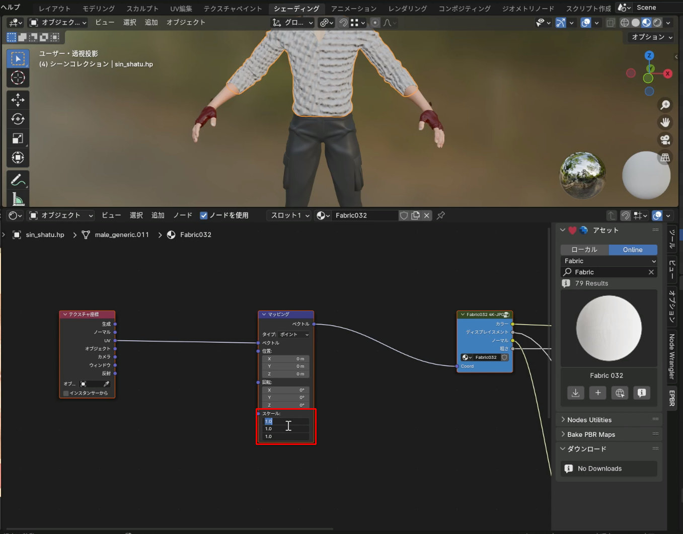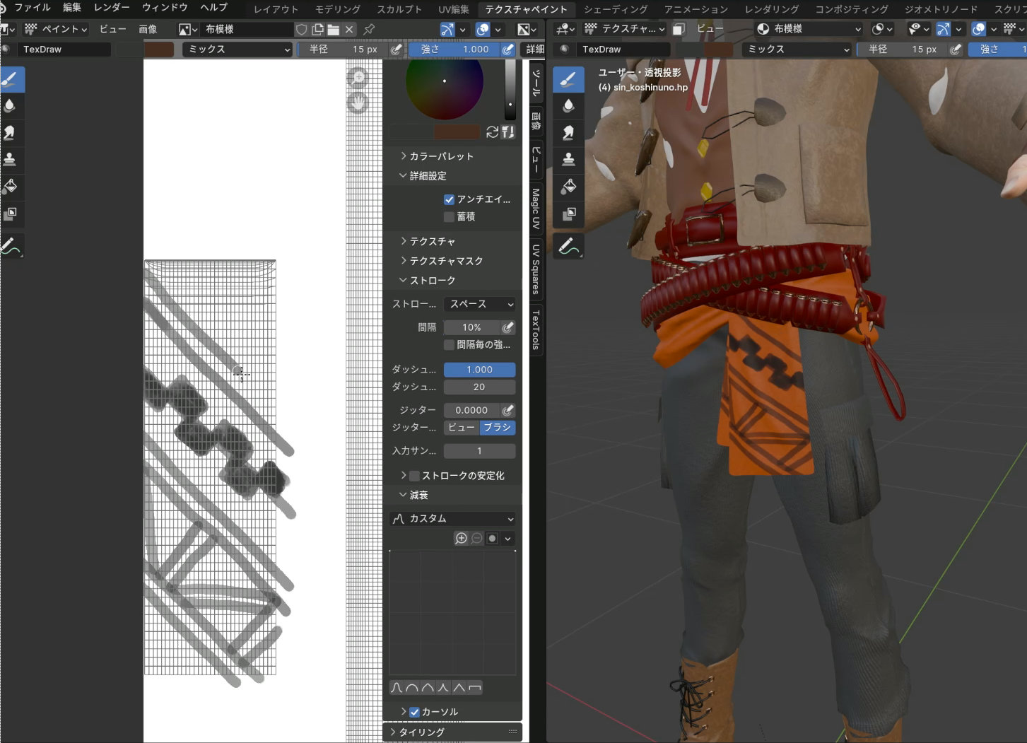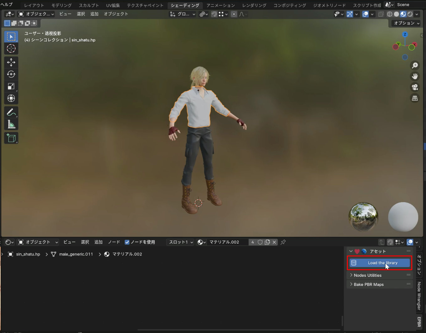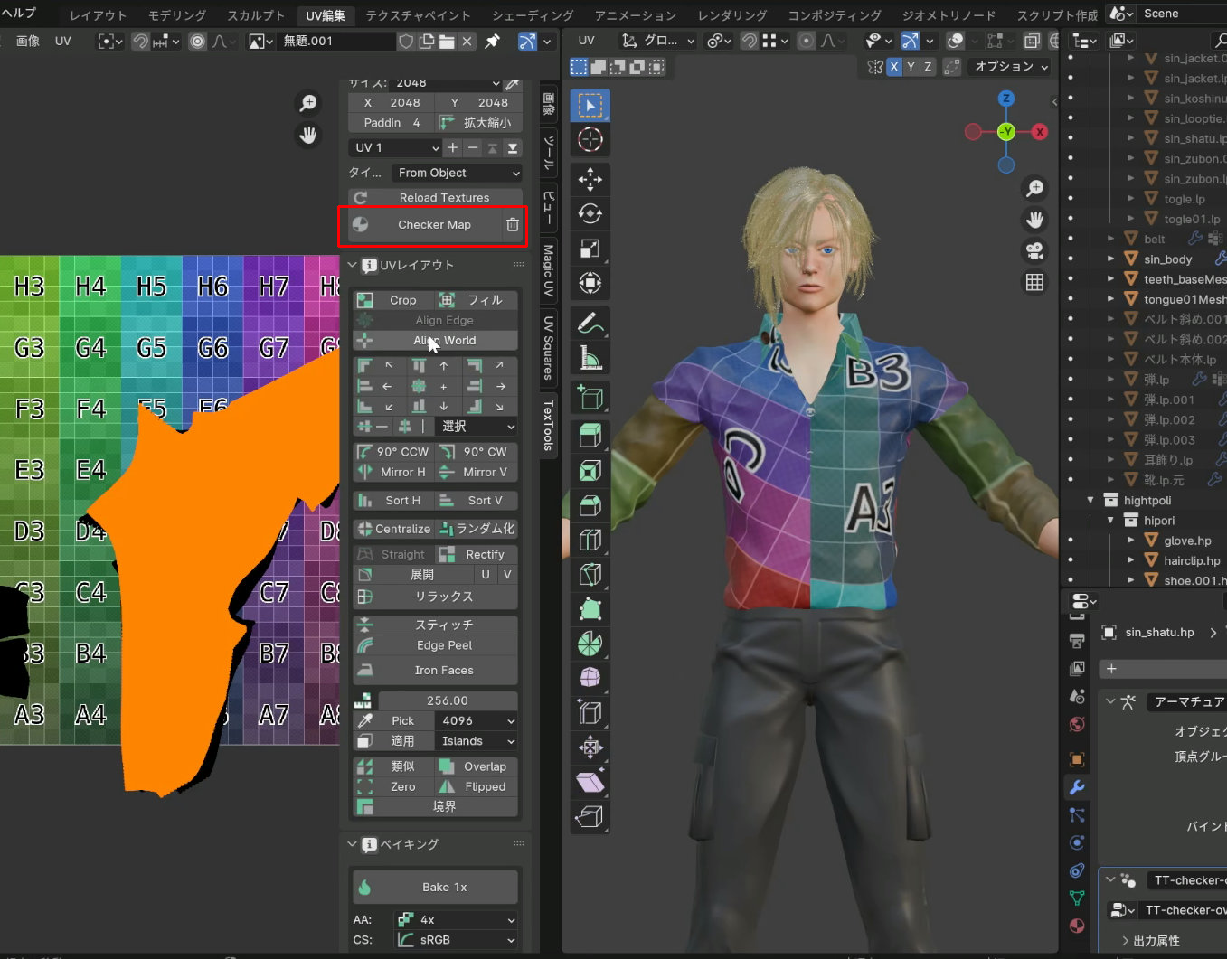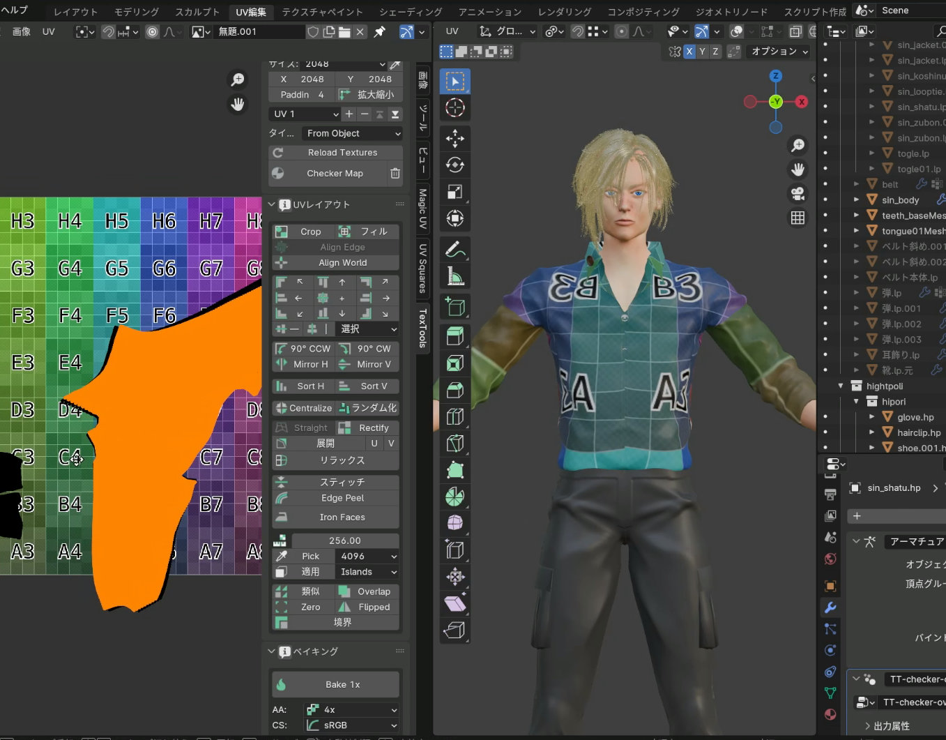 この後、正式なマテリアルを設定したり、服のシワなどの凹凸を作ったり、各オブジェクトのマテリアルをテクスチャ化したりする作業があります。