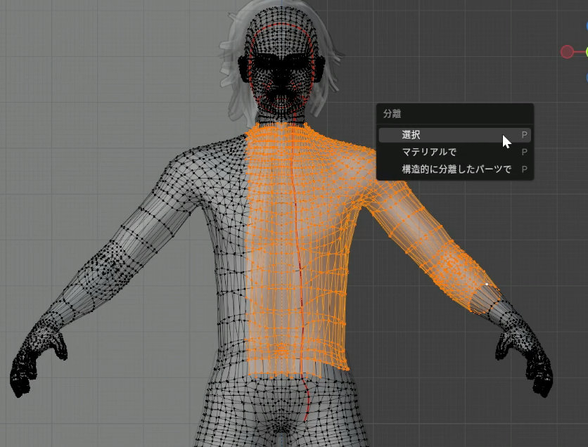 P→選択を押して複製したメッシュを別のオブジェクトに分離します。