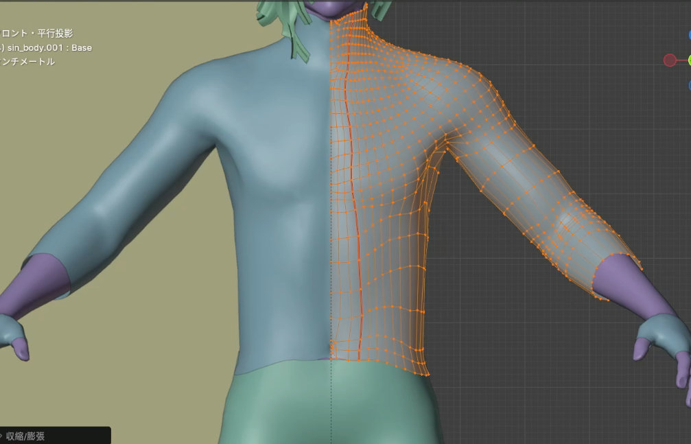 シャツやズボンなど、体に沿った服を作る場合、体のメッシュをコピーして形を整えます。