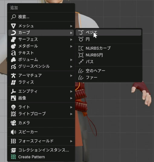 頂点を増やしたいときは二点を選んだ状態で右クリック→細分化を選択するか、先端を選んだ状態でEを押してカーブを延長します。
