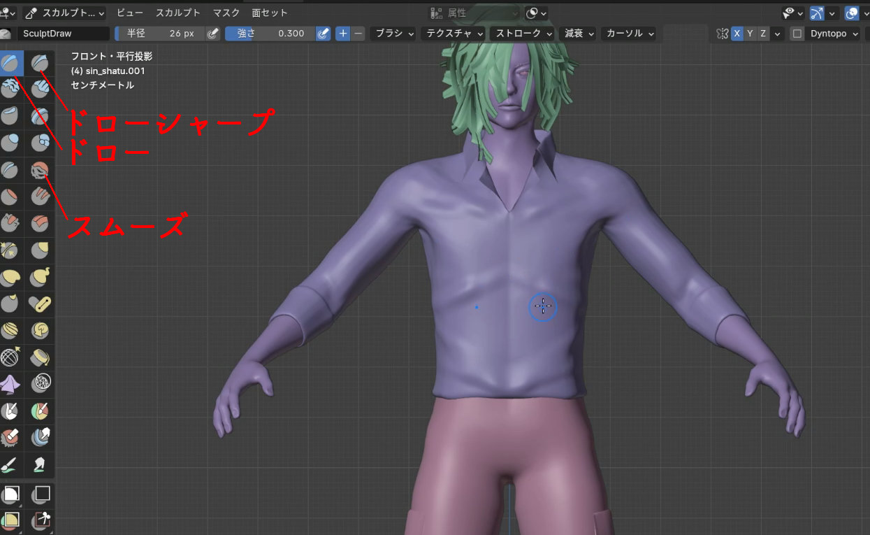 スカルプロモードのグラブブラシや編集モードのプロポーショナル編集を使ってメッシュの形を整えます。