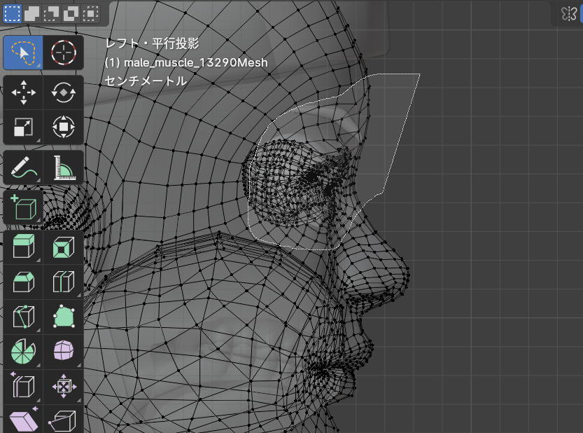 透過表示にしておき、投げ縄選択で目と眉毛の周りを選択します。