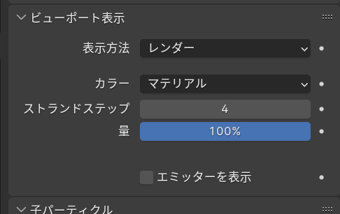 ビューポート表示のストランドステップを4、エミッターを表示からチェックを外しておきます。