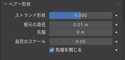 ヘアー形状の根元の直径を0.01に、直径のスケールを0.05にします。