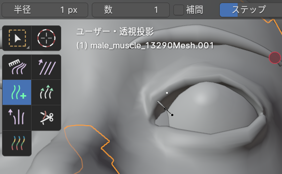 追加ブラシを選択して毛を植えていきます。追加する毛の数は1にしておきます。