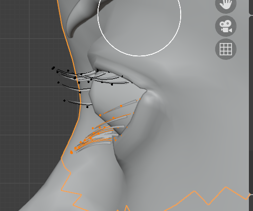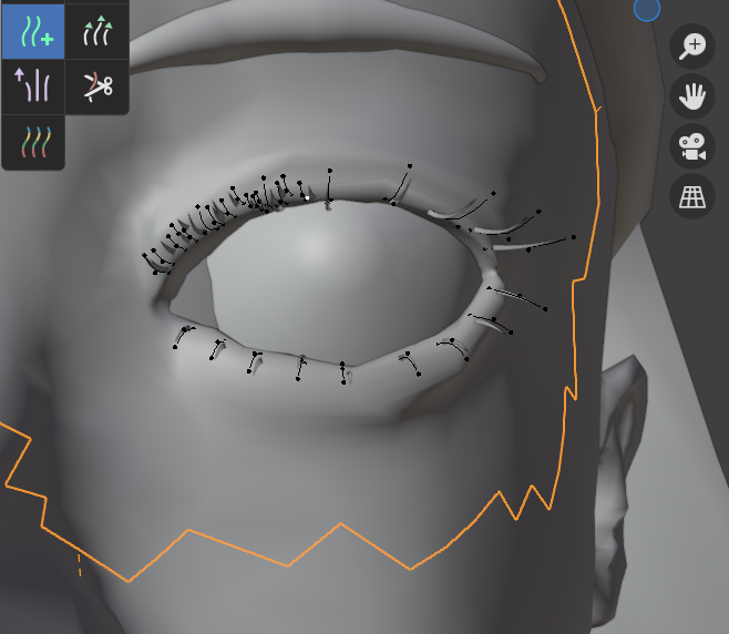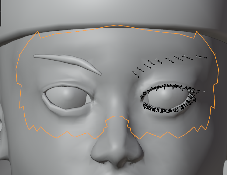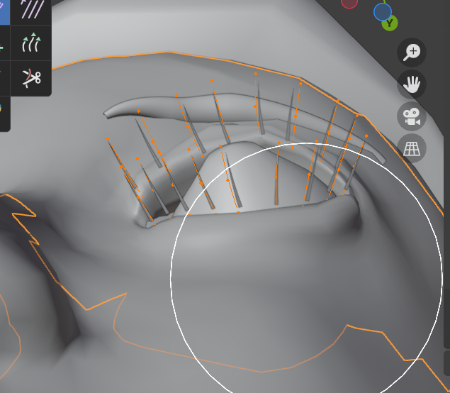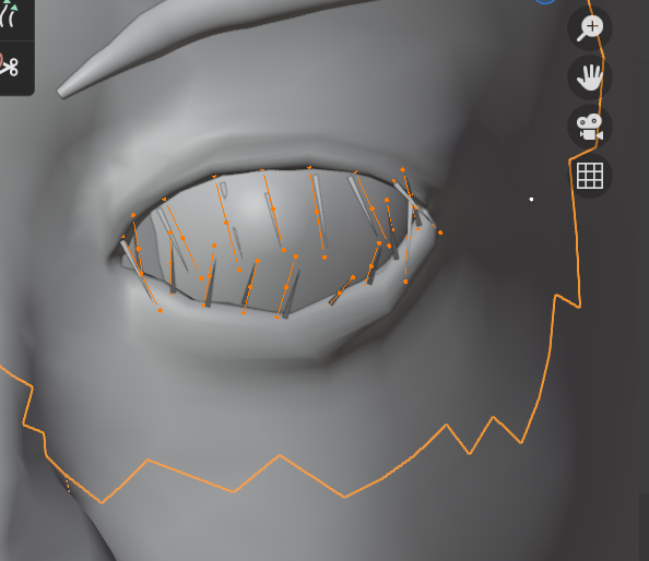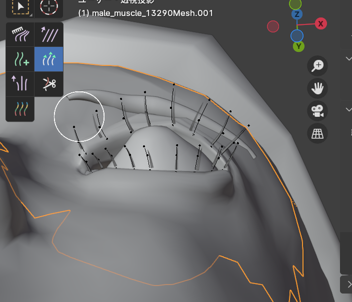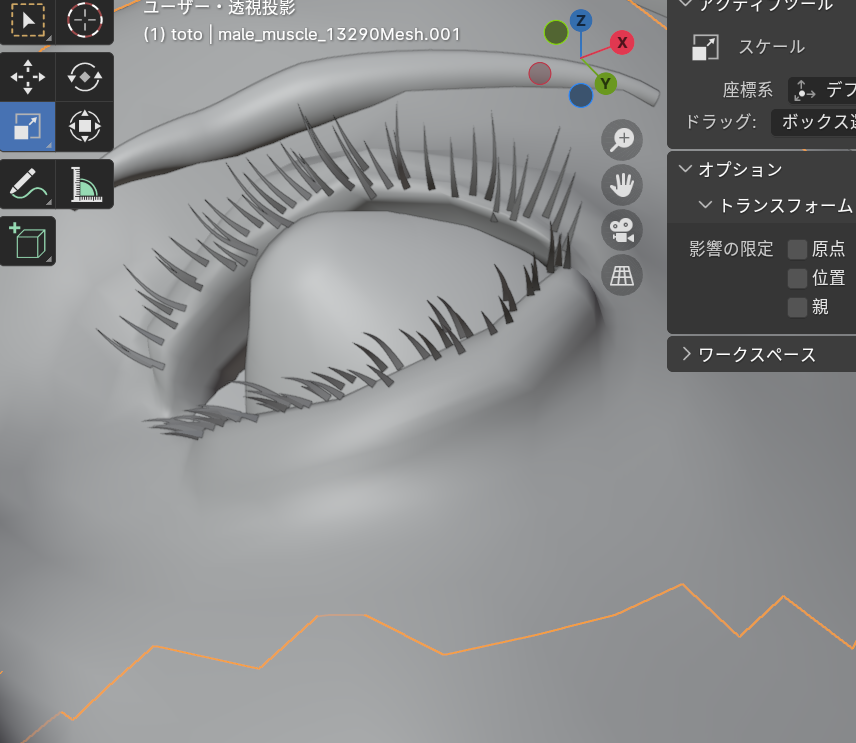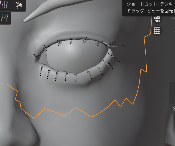 Alt+Aで選択解除してから下まつ毛だけをすべてLでリンク選択して、下まつ毛の形状を整えていきます。