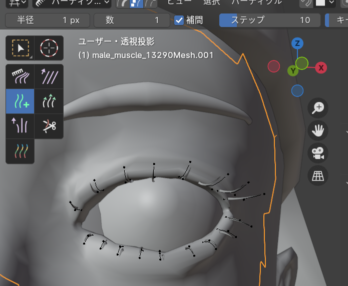 全体の形が整ったらまつ毛の時と同じように、追加ブラシの補間にチェックを入れて隙間の毛を植えていきます。