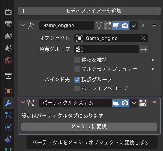 モデファイア一覧のパーティクルシステムから、メッシュに変換を選択します。