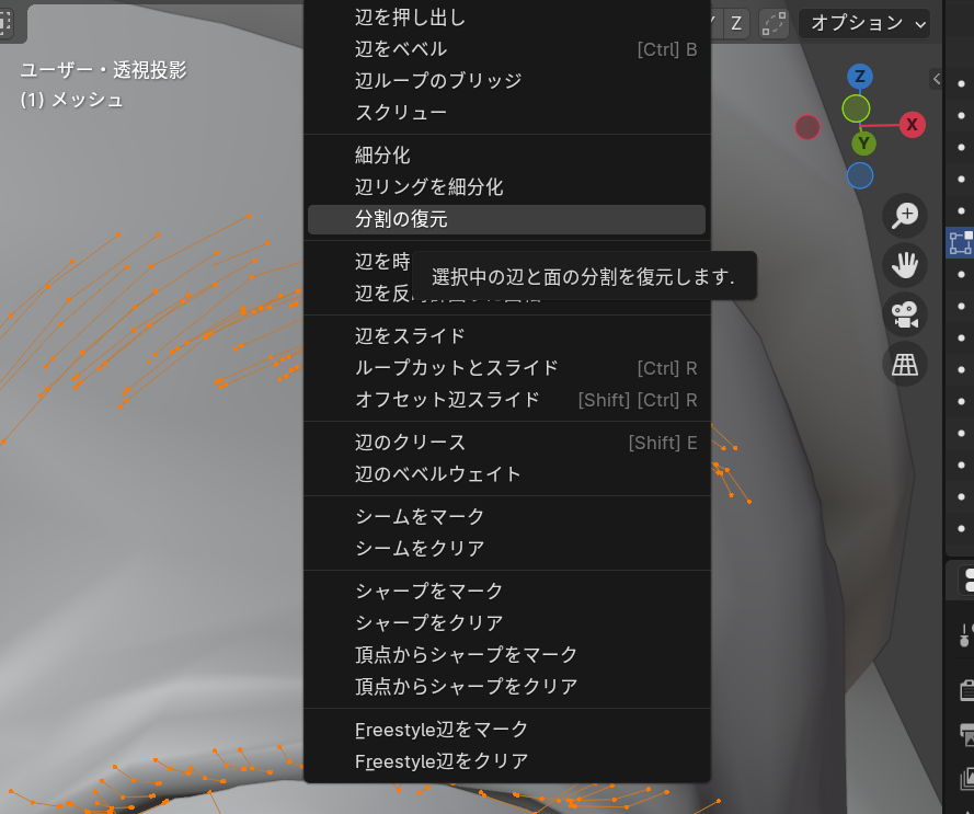 編集モードに入り、メニューの辺から分割の復元を選択します。