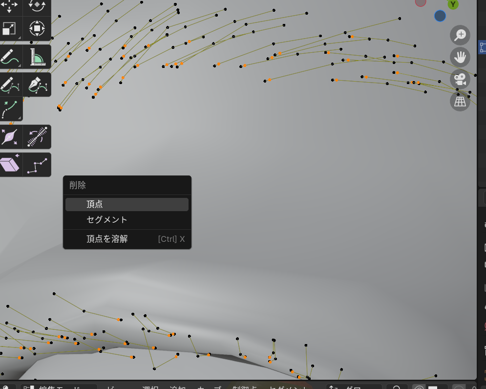編集モードに入り、根本を選択⇒選択の拡大⇒根元を選択(解除)をしてからXで頂点を削除します。