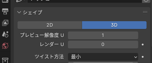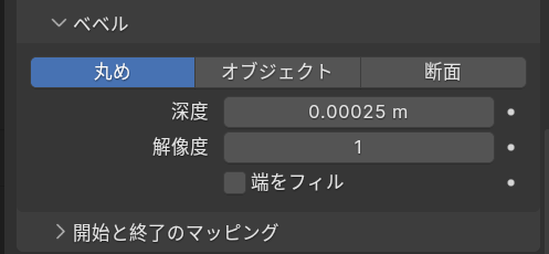 カーブのプロパティでシェイプのプレビュー解像度を1に、ベベルの深度を0.00025、解像度を1にします。