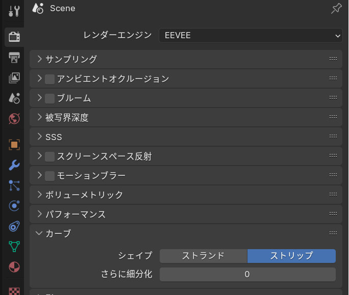 レンダーでEEVEEの設定でカーブ→シェイプをストリップにします。