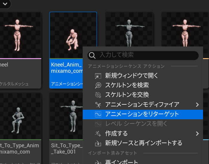 ダウンロードしたアニメーションの上で右クリックして、アニメーションをリターゲットをクリックします。