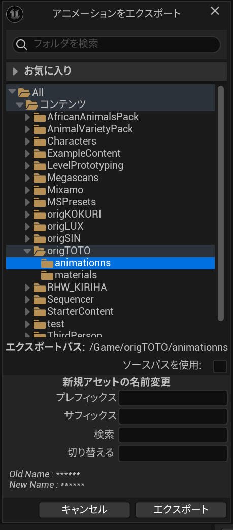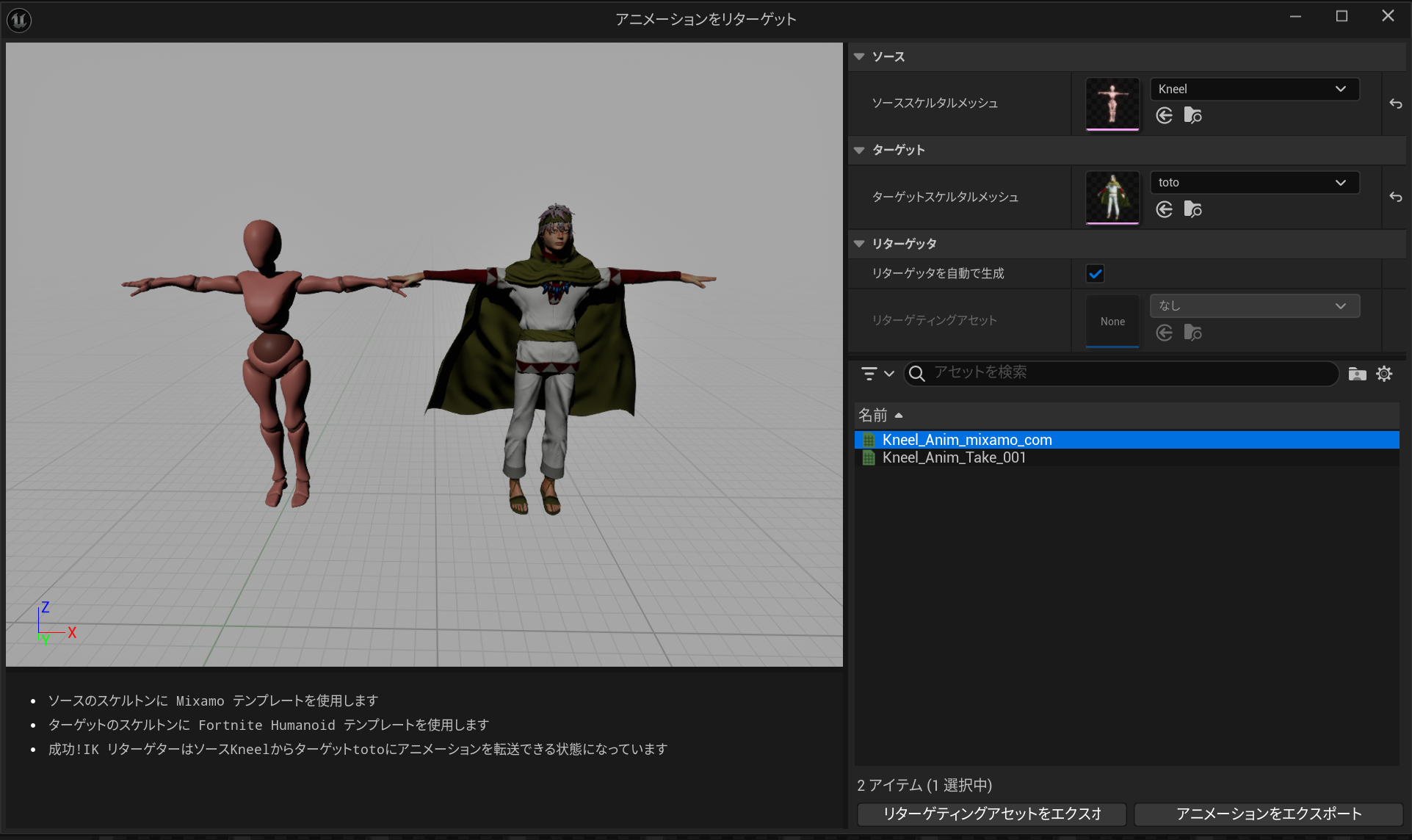 ターゲットスケルタルメッシュに自作モデルを設定して、リターゲットしたいアニメーションを選択し、アニメーションをエクスポートをクリックします。