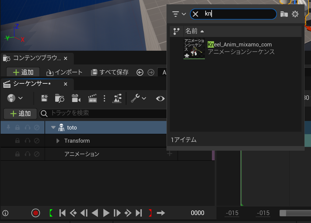 シーケンサーの追加ボタン、シーケンサにアクタを追加の順でクリックして右に出てくるリストから先ほどレベルに追加した自作モデルのスケルタルメッシュを選択します。