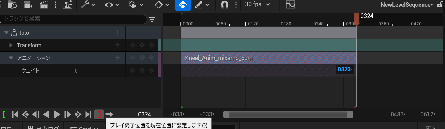 シーケンサーの緑の[(アニメーションの開始点)と赤い](アニメーションの終了点)をアニメーションの長さに合わせます。