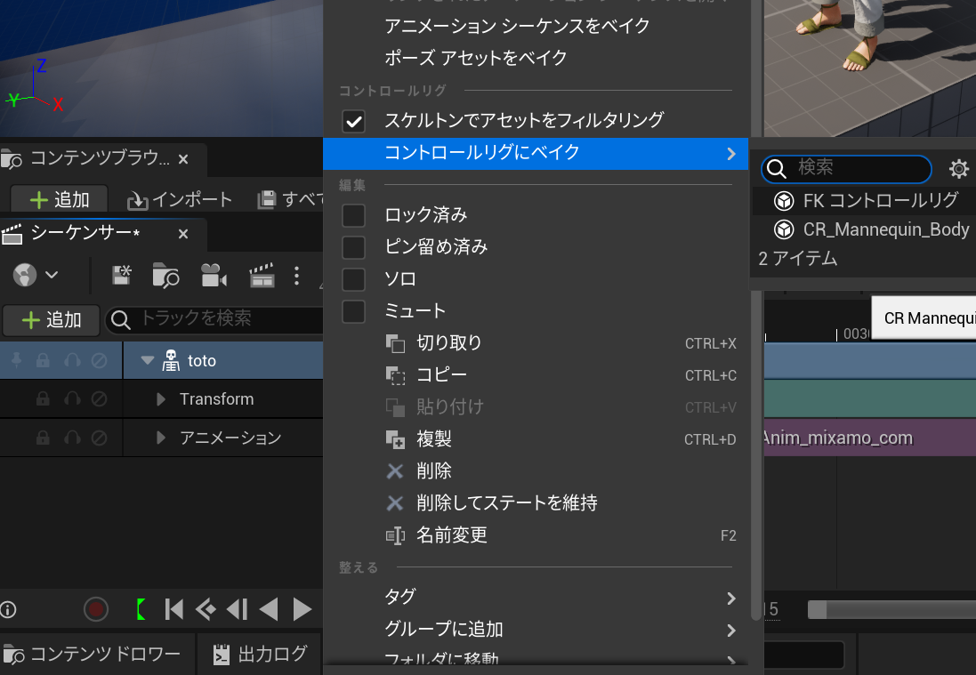 シーケンサーの自作モデルのスケルタルメッシュ上で右クリックし、コントロールリグにベイク、CR_Mannequin_Bodyを選択します。