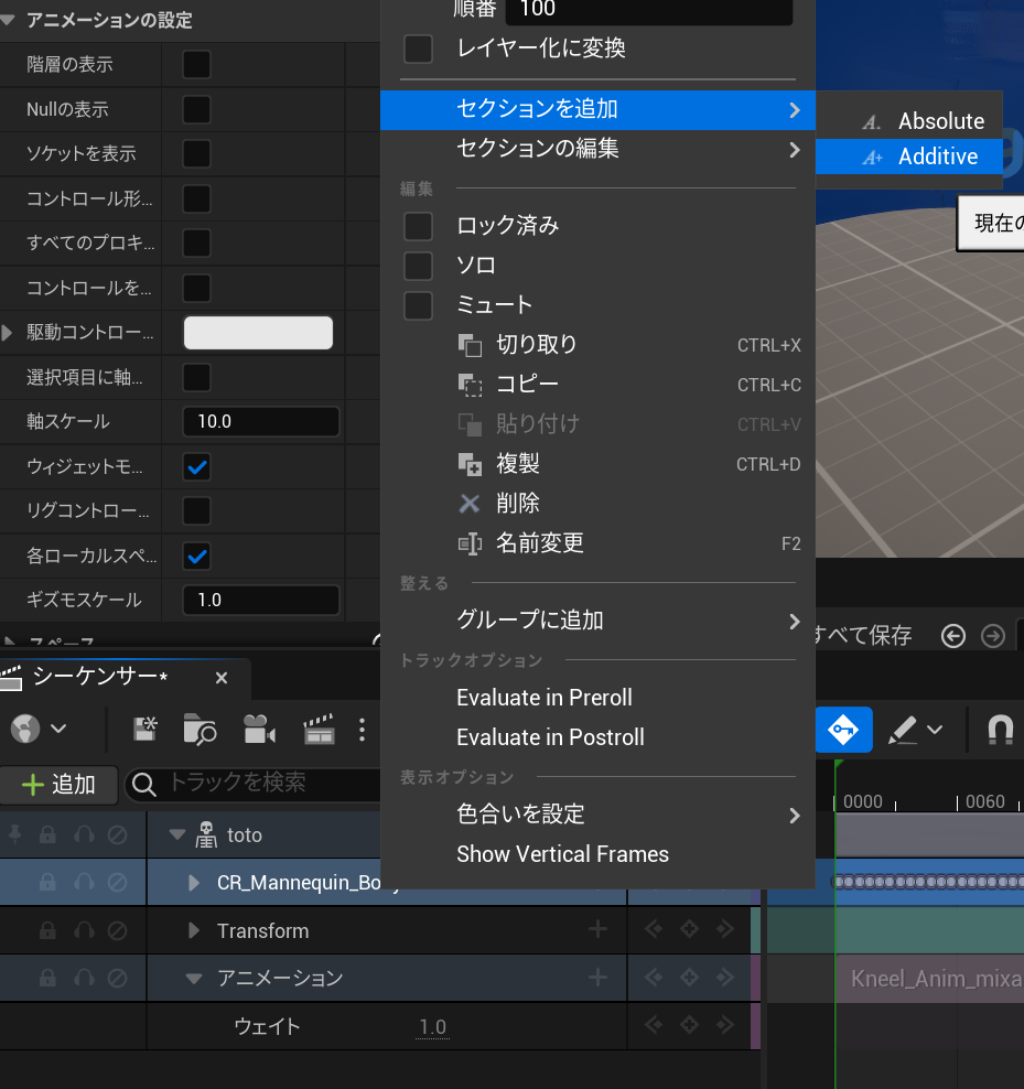 コントロールリグ上で右クリックしてセクションを追加、Additiveを選択します。