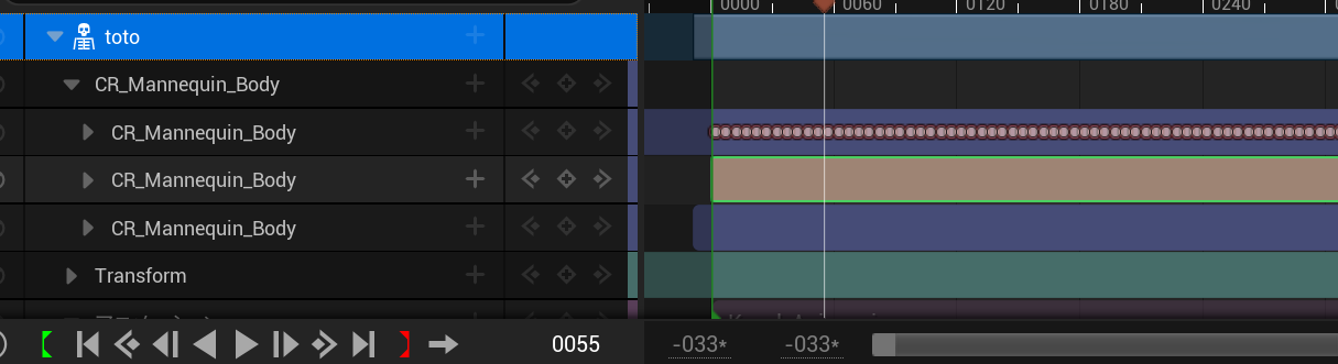 スケルタルメッシュの下にあるアニメーションの+マークをクリックして、改造したいアニメーションを選択します。